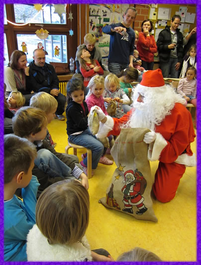 Auch bei uns in der Kita schaute der Nikolaus nach dem Rechten und beschenkte am 05.12.11, bei einer kleinen Nikolausfeier, die Kinder. Dem Nikolaus, er weiß wer gemeint ist, sagen wir ganz lieben Dank für die schönen Worte zu unseren Kindern. Bis auf die täglichen, gruppeninternen Feste zum Advent und rund um den Adventskalender kehrt nun so langsam  ein bisschen Ruhe in die Tagesstätte ein. Wir haben Zeit für Geschichten rund um Weihnachten, für Gespräche über die vielen Wünsche der Kinder und jeder freut sich auf Heilig Abend.