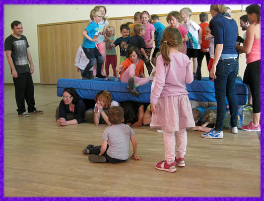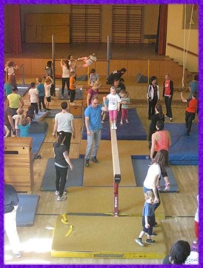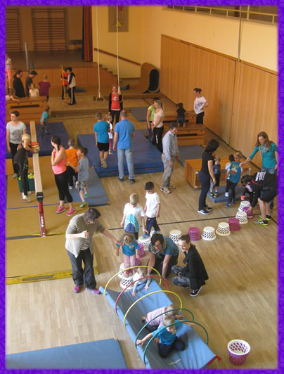 Am Sonntag, 19.April 2015 fand unser großer Bewegungstag in der Turn-und Festhalle Rheinzabern statt. Eingeladen waren alle Familien der Kita Faustina mit Freunden und Interessierten.  Wir hatten alle Räumlichkeiten der Turn-und Festhalle ausgenutzt um möglichst viele Bewegungsmöglichkeiten und Bewegungserfahrungen zu ermöglichen. Im Proberaum der Musiker und Sänger fand unser Yoga-Workshop statt. Im Speisesaal konnte man die elementaren Inhalte der Psychomotorik begreifen und erleben. Bei schönstem Sonnenwetter wurde auch die Spielwiese für bewegtes Lernen im Freien genutzt und die große Halle wurde in eine riesige Gerätelandschaft umgebaut, die Groß und Klein zum intensiven Bewegen und Spielen einlud.